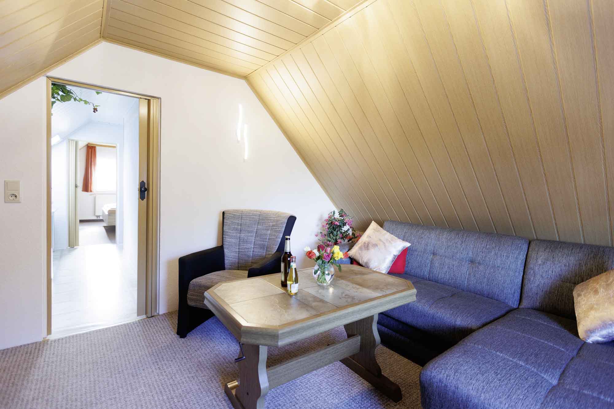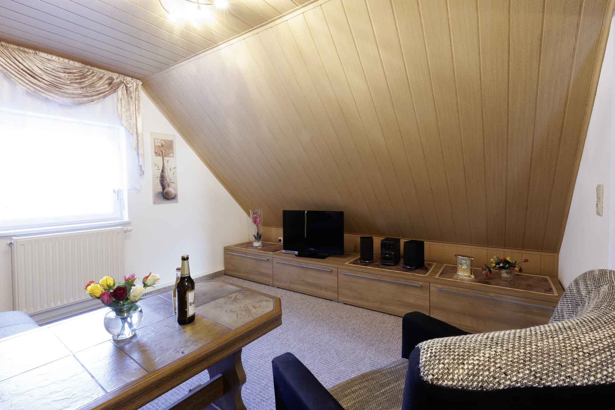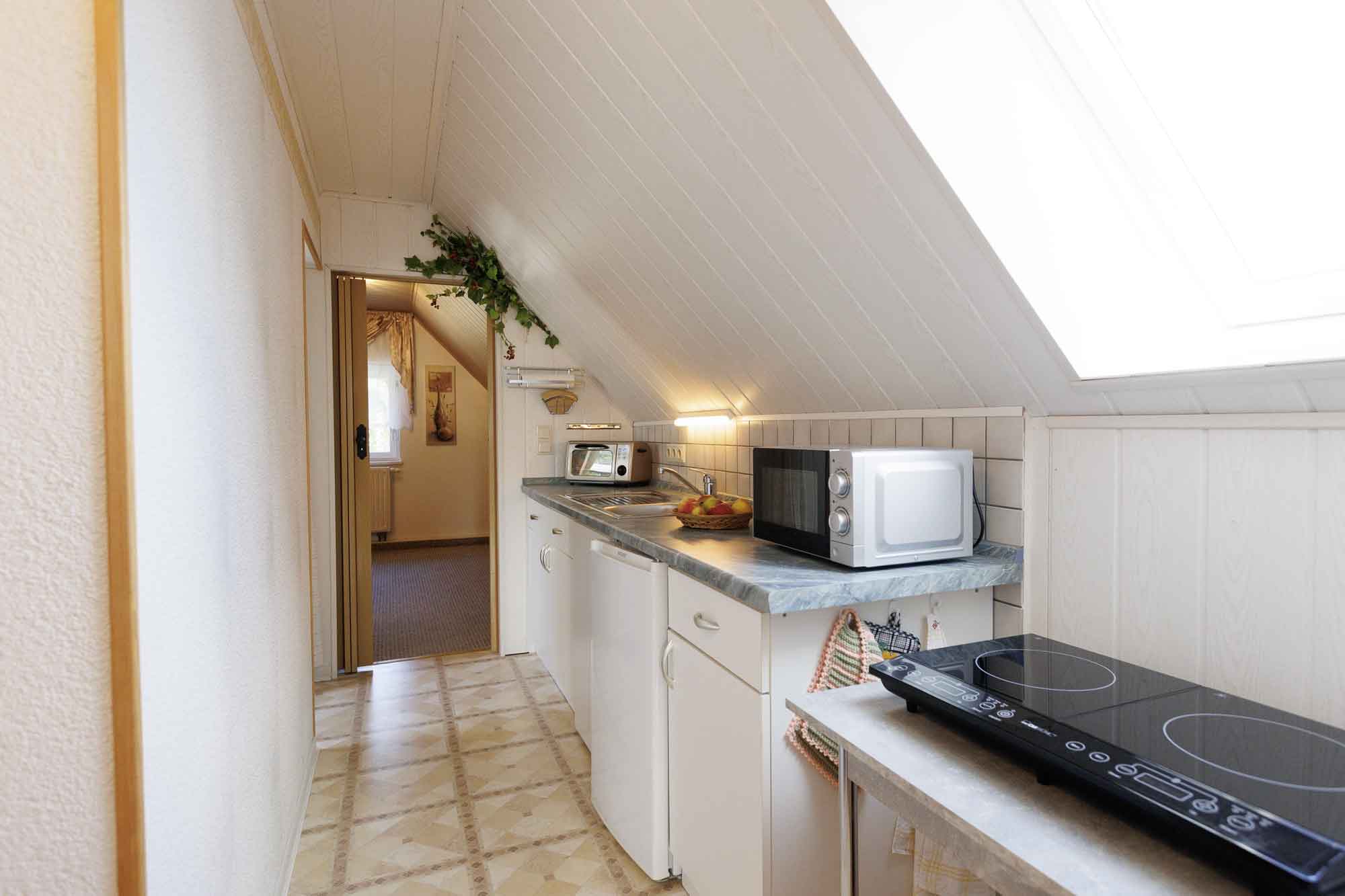 Unsere Ferienwohung im Dachgeschoss hat bedingt durch die Dachschrägen eine Größe von ca. 35 m2, verfügt aber auch über ein gemütliches Wohnzimmer, ein Schlafzimmer mit Doppelbett, ein Bad mit Dusche/Waschbecken und WC und eine voll ausgestattete Küche mit Induktions-Kochfeld, Geschirrspüler, Mikrowelle, Kaffeemaschine u. v. m. Sie bekommen von uns Bettwäsche sowie Hand- und Geschirrtücher gestellt.